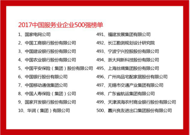 在中國企業聯合會舉辦的2017中國服務業企業五百強排名中,公司獲得第495位。